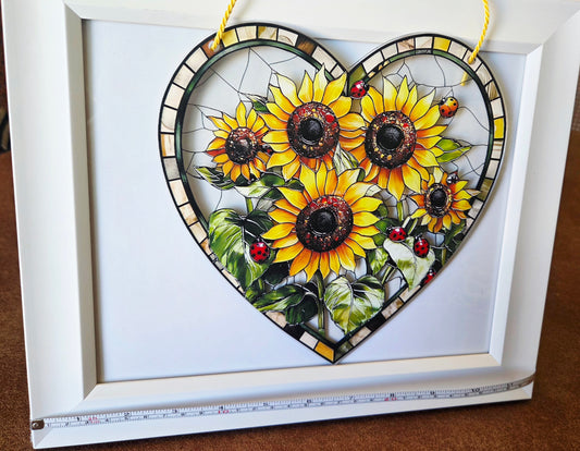 Heart of Sunshine Stained Glass Suncatcher – Sunflower & Ladybug Window Art